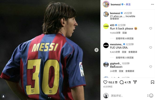 梅西配图并写道:“21年了啊……真是难以置信。”